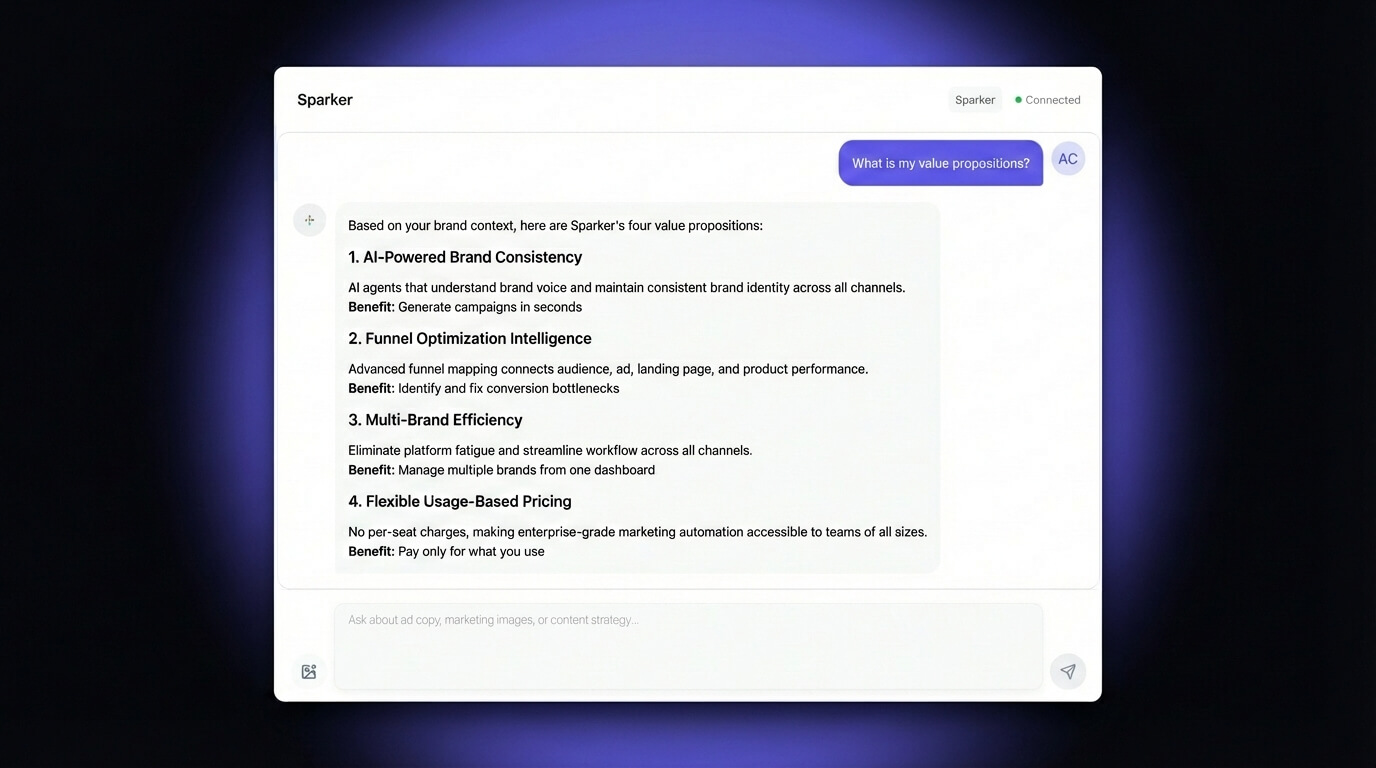 From creative generation to funnel analytics, Sparker gives your team AI superpowers without the learning curve.