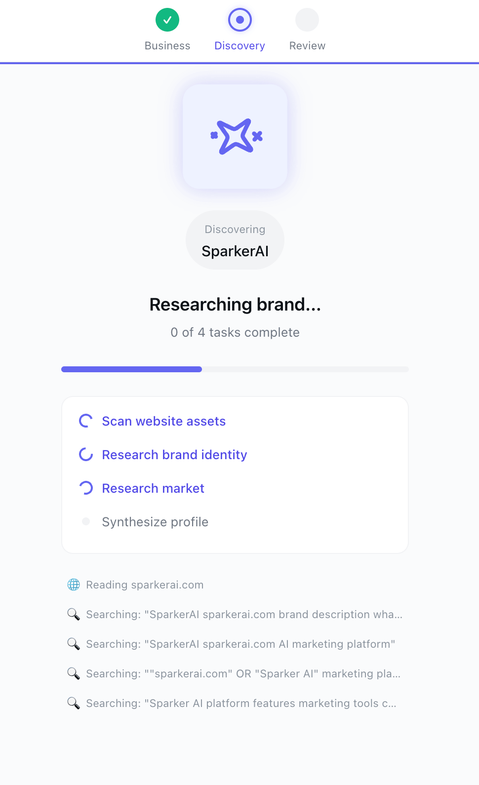Enter your business name. Sparker’s AI researches your website, analyzes your market, and extracts your brand identity — colors, voice, audience, and competitive landscape. No forms to fill out.