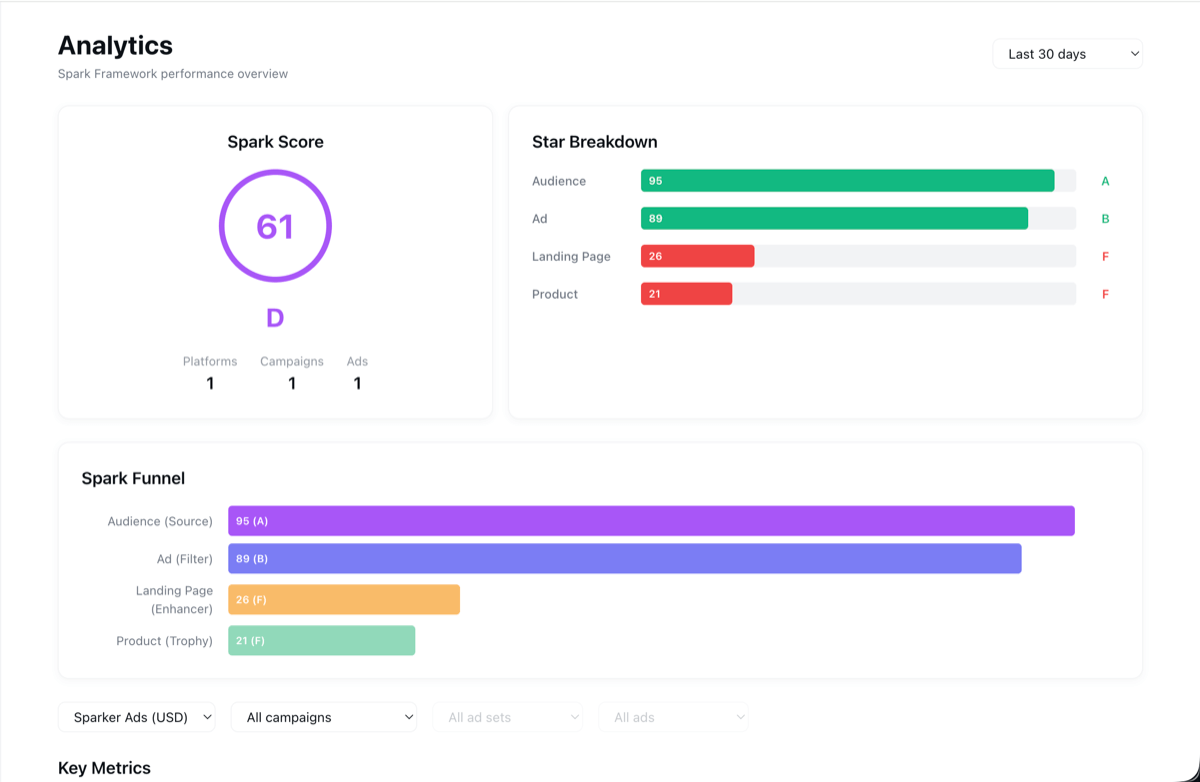 The Spark Framework maps your entire funnel — Audience, Ad, Landing Page, Product — and identifies exactly where conversion drops off.